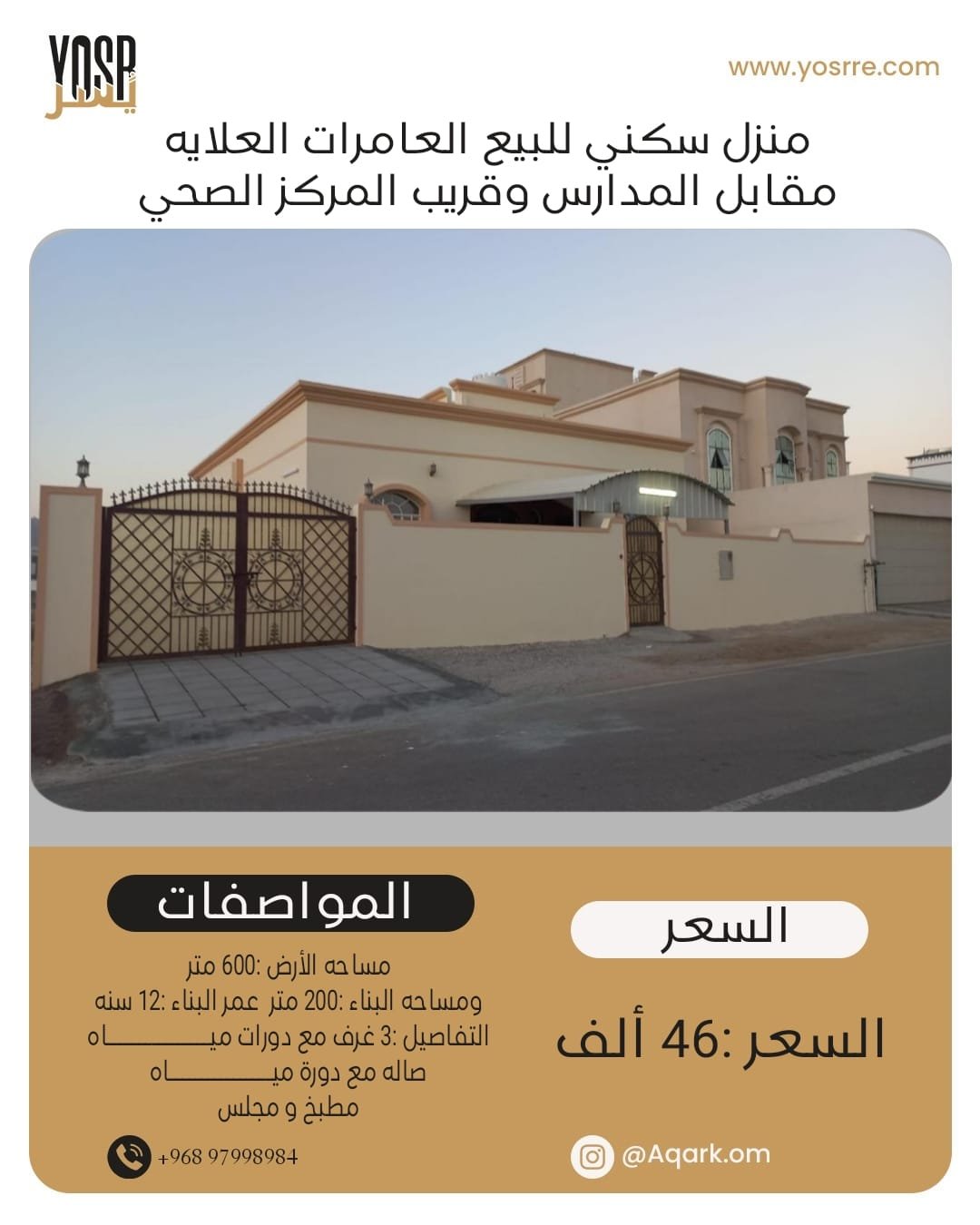 منزل سكني للبيع الموقع : العامرات العلايه الخدمات المتوفره: مقابل المدارس وقريب المركز الصحي ومساجد ومطاعم موقع الإرض كورنر وحوش كبير فالخلف قابل لبناء شقق مساحه الأرض :600 ومساحه البناء : 200 متر عمر البناء : 12سنه التفاصيل : 3 غرف مع دورات مياه والغرفه الثالثه حمام مشترك مع الصاله - صاله - مطبخ - مجلس