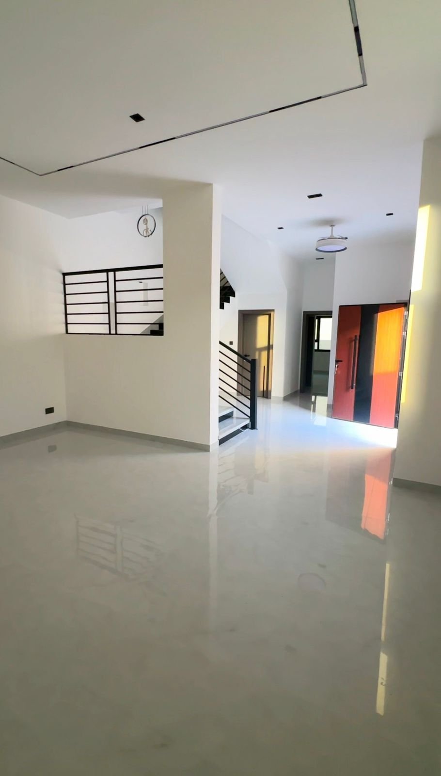 صالة كبيره مفتوحه مع الدرج ومكان تقديم الطعام ودورة مياة للصالة .